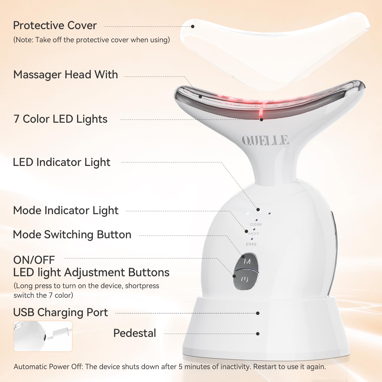 Revitalize your skin with the QUELLE Face & Neck Massager AM-816. Equipped with 7 LED color therapy modes and 3 operating intensities, this device targets wrinkles and helps firm skin.